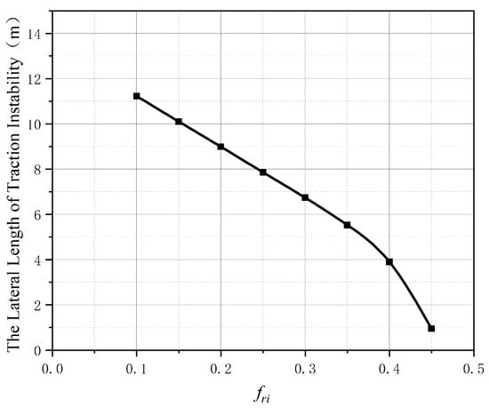Figure 17 shows the later length traction instability as a function of fri (the friction coefficient of the bottom surface of the i-th layer most affected by excavation). The curve can also be divided into two parts, as shown in Figure 17. When fri < 0.35, the two are linear; when fri > 0.35, the larger the fri, the faster the lateral length of traction instability decreases. It can be seen that the two factors fpi and fri have a great influence on the lateral length of traction instability.