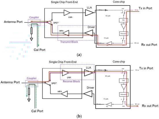 Identification of the paths of the electrical signals for the (a) TX mode of operation and (b) RX mode of operation. The corresponding calibration modes of operation involve also the directional coupler and the calibration port (Cal Port).
