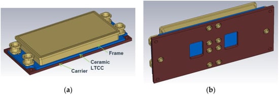 The LTCC multilayer substrate, based on a high-frequency, low-dielectric loss tape system manufactured by FERRO (A6M-E), features embedded RF structures inside its inner layers, such as RF transitions, RF couplers, and RF combiners. The design of the RF passive devices and interconnects will be analyzed in detail in Section 3.
