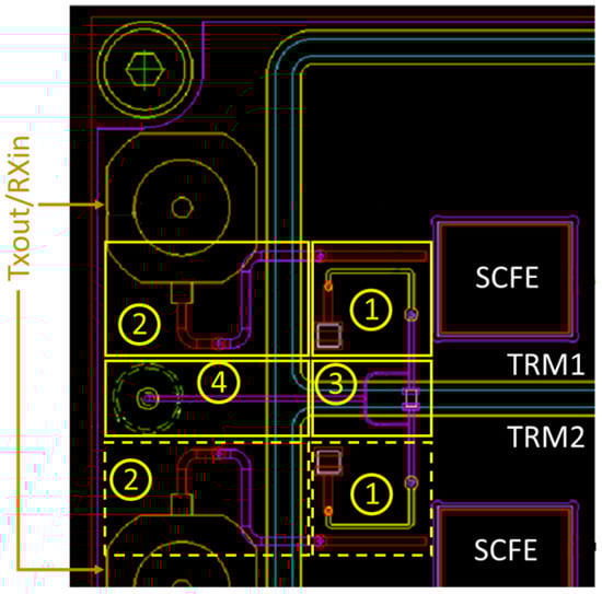 The TRM portion of interest between the SCFE and the antenna connector is shown in Figure 3. Each single RF line to be accurately designed is enclosed in a yellow rectangle and identified by a specific number from one to four: