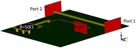 The directional coupler is necessary to couple the SCFE output signal from/to the calibration port. It was designed to have a coupling factor of about −30 dB and a directivity better than 15 dB. The design principle was quite simple, involving a trace close by the SCFE output microstrip, although a fine optimization was necessary to reach the desired values. The initial structure and the port numbering for evaluating the coupler performances are shown in Figure 4. The coupled line is buried in the second stack-up layer to minimize the risk of corona discharge, since the latter is attenuated by the dielectric interposed between the SCFE output microstrip (on the top layer) and the coupled line on the second layer (embedded microstrip type of interconnect). The unneeded port of the directional coupler is loaded by a 50 Ω termination connected to the ground layer. The 50 Ω resistor is directly printed on top of the substrate, and on the top layer, there are conductive pads using a conductive material with 100 Ω/□ resistance. The final design parameters are shown in Figure 5.