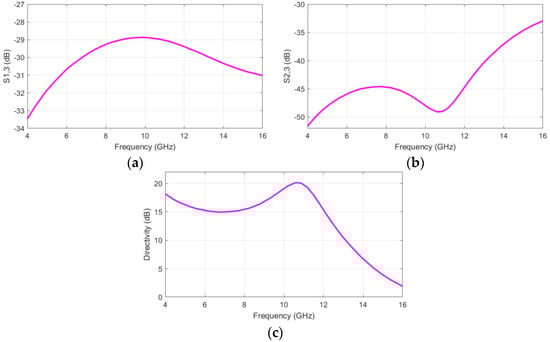Optimized design of the coupler (final optimized responses highlighted in purple). (a) Coupling factor (S13). (b) Isolation (S23). (c) Directivity computed as D(dB) = S13(dB) − S23(dB).