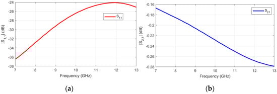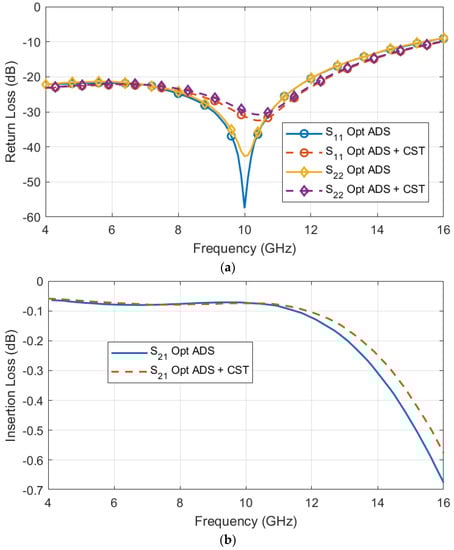 The optimization of the transition was performed in two steps. The first one involves the vertical transition and a small piece of stripline up to the point where a TEM mode is propagating. A waveguide port [] was set at the stripline, whereas the output port was defined at the coaxial interface on the substrate external layer; the two-port S-parameter of the transition was obtained through a full-wave simulation. The S-parameter dataset was used within the circuit simulation environment [], where three transmission line sections were added. Such three sections were optimized for length and width (characteristic impedance) to achieve optimized performances of the S11 and S21. Once the optimized results were satisfactory, the obtained geometrical parameters (length and width) of the three lines were translated into actual stripline sections added to the original full-wave model to verify the optimized performances. The final results are reported in Figure 11 for the stripline to coaxial transition, with a comparison between the circuit and full-wave simulation. Good agreement was obtained, thus demonstrating the feasibility of the quick circuit-based optimization compared to the much more time-consuming full-wave optimization.
