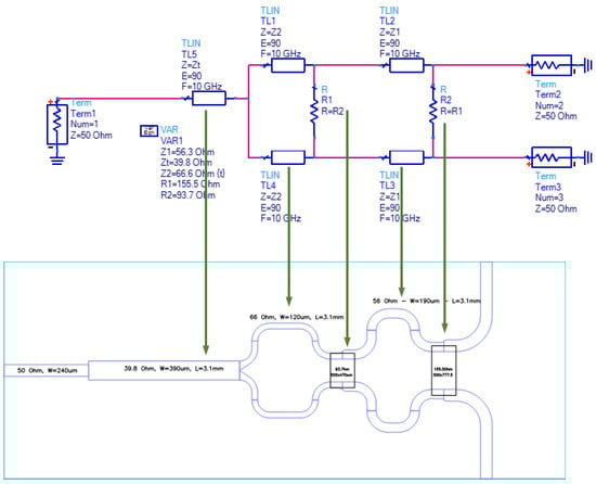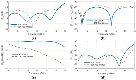 A power divider/combine was designed with the objective of reducing the part count, in particular to halve the number of coaxial connectors necessary for TRM calibration. Basically, the proposed solution employs only one calibration connector for two TRMs. The calibration signal during the receive calibration mode is sent to two TRMs; thus, it should be split equally between the TRMs. Additionally, when performing the calibration of the transmitting path of each TRM, the high-power signal at the output of the SCFE is coupled toward the calibration port through the coupler and the Wilkinson divider, with the side TRM being turned off. The power divider was first designed based on well-known theory [] by selecting the number of stages as two to achieve the required bandwidth. Then, it was implemented into the circuit simulator [] for refinement and geometry tuning/optimization. Then, the optimized circuit was implemented into the full-wave simulation environment to verify its performances. The equivalent circuit and the full-wave models are reported in Figure 8, whereas the final results in Figure 9 show the comparison of the relevant S-parameters between the circuit and full-wave responses. Specifically, the return loss at Port 1 and at Port 2 (and 3) are shown in Figure 9a,b, whereas the insertion loss and coupling factor are given in Figure 9c,d, respectively. Good agreement was found, although the insertion loss from the full-wave model was affected by the metal and dielectric losses initially neglected in the circuit simulator. Moreover, the slight differences that can be seen in the frequency range 12–14 GHz in Figure 9a,b are mainly due to the coupling between the microstrips, since the circuit model does not take it into account.