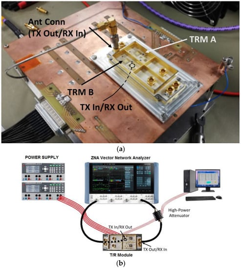 The design of the RF transitions discussed in Section 3 and the complete assembly of the TRM with the SCFE, the core-chip, and the auxiliary amplifiers (LLA and driver) in Figure 1 led to the manufactured TRM shown in the experimental setup in Figure 12 for testing the fully assembled TRM B, whose output (antenna) power was detected by Port 2 of the VNA through the semirigid coaxial cable connected at the TRM antenna connector. The input power was provided to the TRM B by VNA Port 1 through the input coaxial connector placed under the TRM. The output power is a derived value from the input power set at the Port 1 and the gain (S21) measured by the VNA. Due to the expensive SCFE and core-chip devices, only two TRMs were fully assembled, whereas the other two were equipped with coaxial connectors for the verification of the passive interconnects.