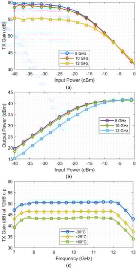 The relevant experimental data that characterize the TRM in transmit mode are the gain and the transmitted power. They are reported in Figure 13 as the function of the input power for the three frequency values toward the limits and in the middle of the band of interest at 8 GHz and 12 GHz and then 10 GHz, respectively. The gain in Figure 13a is quite constant for input power level below −25 dBm, as expected; then, it decreases while getting close to the maximum power that can be provided by the final HPA stage of the SCFE. In fact, the output power Pout reaches its maximum of 41.5 dBm when the input power Pin exceeds −10 dBm. The transmitting amplification chain is not expected to work in the linear region, but instead in the compressed region to ensure a more constant gain over frequency. Figure 13c shows the gain as the function of frequency evaluated at the 12 dB compression point (c.p.) after setting the input power Pin = −3 dBm. The gain variability is within 0.5 dB, thus ensuring the required in-band variation.