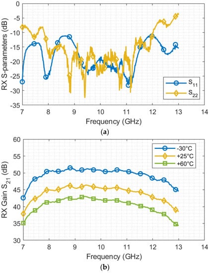 The receive mode is also experimentally characterized by measuring the input and output return loss and the RX gain. The RX chain works in the linear region due to the very low power expected from the antenna. The S11 (from the antenna port) and S22 (from the RXout Port) are shown in Figure 14a, whereas the S21 (RX gain) is reported in Figure 14b. The noise figure (NF) is the last parameter that requires a careful evaluation, since it greatly impacts the sensitivity of the overall RX chain and thus the level of the minimum detectable signal received by the antenna. The procedure for measuring the NF is described by the following steps: