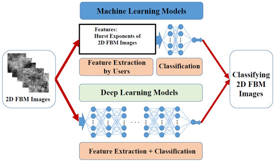 Figure 1 shows our adopted two procedures for classifying 2D FBM images—one is through machine learning models and the other through deep learning models. For machine learning models, we first compute the Hurst exponent of 2D FBM images through the efficient MLE [22] as our only feature; then, we use machine learning models to classify the classes of 2D FBM images according to the predictor—the Hurst exponent. For deep learning models, we design a simple deep learning model and adopt some pretrained models to automatically extract various hidden features and recognize the classes of 2D FBM images.