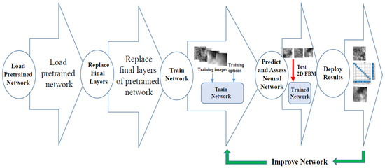 Since 1995, transfer learning has attracted the attention of many researchers. It has many different names, such as learning to learn, life-long learning, inductive transfer, knowledge consolidation, and increment learning. In this paper, we use our proposed simple sequential deep learning model and three pretrained models—AlexNet, GoogleNet, and Xception—performed on MATLAB. For pretrained models, transfer learning is required to meet the classification problem of 2D FBM images. Figure 2 is the procedure for transfer learning of pretrained models on our issue.