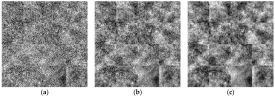 To understand some possible appearances of different Hurst exponents, Figure 3 shows three images, each with 16 patches of FBIs of size 32 × 32 × 1 generated from H = 1/22, H = 3/22, and H = 5/22; Figure 4 shows three images, each with 16 patches of FBIs of size 32 × 32 × 1 generated from H = 7/22, H = 9/22, and H = 11/22; Figure 5 shows three images, each with 16 patches of FBIs of size 32 × 32 × 1 generated from H = 13/22, H = 15/22, and H = 17/22; Figure 6 shows two images, each with 16 patches of FBIs of size 32 × 32 × 1 generated from H = 19/22 and H = 21/22.
