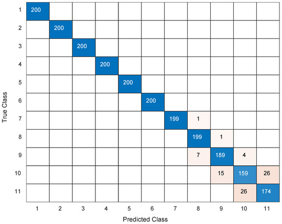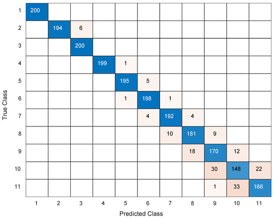 The confusion matrix of SVMs on the estimates of FBIs of 11 Hurst exponents.