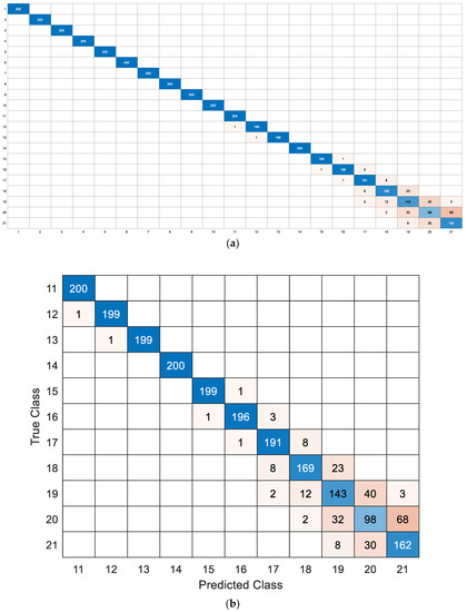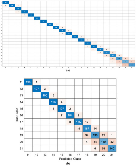 In the case of Type 1, since our image size is different from those of the three pretrained models—227 × 227 × 3 for the AlexNet model (25 layers), 224 × 224 × 3 for the GoogleNet model (144 layers), and 299 × 299 × 3 for the Xception model (170 layers)—and the number of the output classes (11 or 21) is different from 1000 for three models, we adjusted the input layer, fully connected layer, and an output layer of the three pretrained models in order to run these models correctly. For convenience, when we refer to these adjusted models, we call them the adjusted AlexNet model, the adjusted GoogleNet model, and the adjusted Xception model, respectively, or simply AlexNet 1, GoogleNet 1, and Xception 1, respectively.