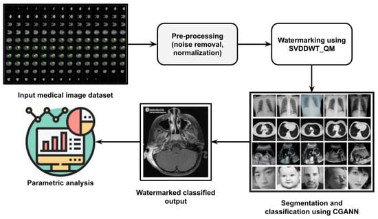 This section discusses a novel technique in digital watermarking with data hiding based on segmentation and classification by deep learning techniques. Here, the used input images are Magnetic Resonance Images (MRI) and Computed Tomography (CT) images, which have been processed for noise removal, smoothening and normalization. The processed image has been watermarked using the Singular Value Decomposition-based discrete wavelet transform quantization model. Regarding watermarked data, it was segmented and classified using convolutional generative adversarial neural networks. The proposed architecture is shown in Figure 1.