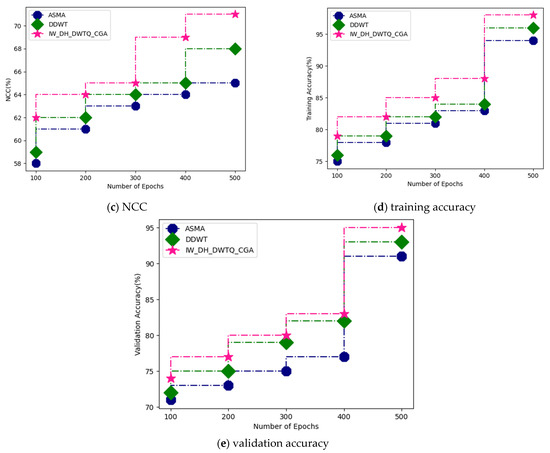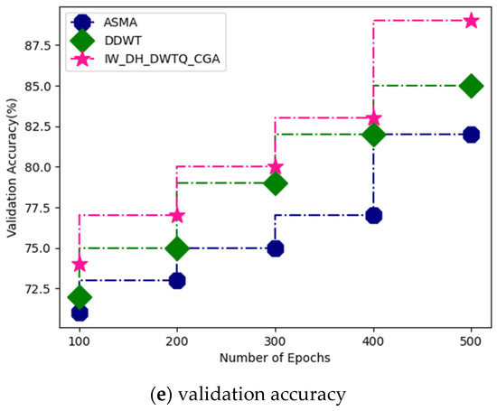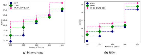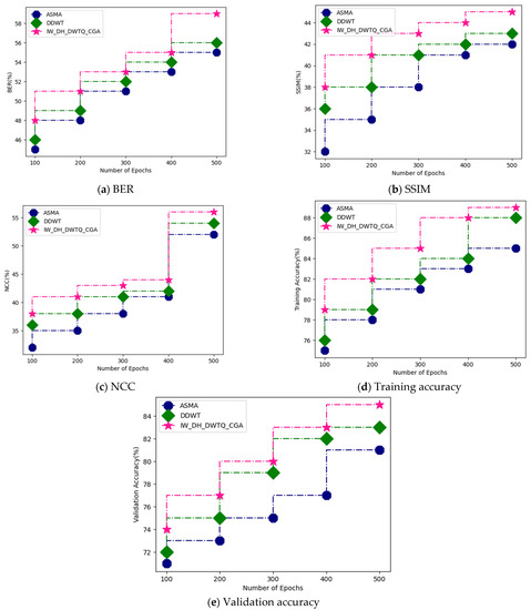 Figure 8a–e shows a comparative analysis between the proposed and existing techniques for the MIAS dataset. The proposed technique attained a bit error rate of 71%, an SSIM of 56%, a Normalized Cross-Correlation of 71%, a training accuracy of 98%, and a validation accuracy of 95%. Regarding ASMA, this attained a bit error rate of 67%, an SSIM of 52%, a Normalized Cross-Correlation of 65%, a training accuracy of 94%, and a validation accuracy of 91%. DDWT attained a bit error rate of 68%, an SSIM of 54%, a Normalized Cross-Correlation of 68%, a training accuracy of 96%, and a validation accuracy of 93%.