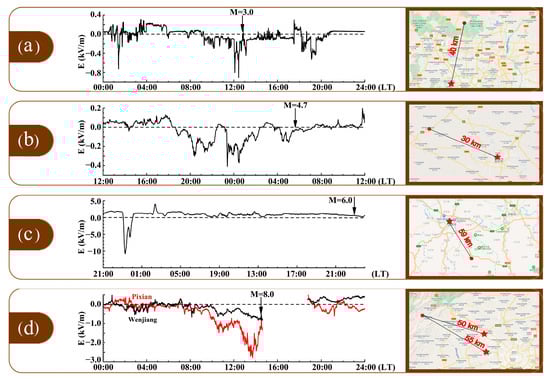 Another case shown in Figure 1d is that for the Wenchuan Ms 8.0 EQ that occurred at 14:28 LT on 12 May 2008 (longitude = 103.32° E, latitude = 31.00° N). Despite a data gap, the Ez signals in Pixian and Wenjiang Counties showed negative values for 7 h before the EQ. Note that the weather in Wenchuan, Pixian and Wenjiang counties was very fair all day as well. The peak negative values of Ez at the Pixian and Wenjiang stations were −2750 V/m and −750 V/m, respectively. The Pixian Station is 50 km from the epicenter, while the Wenjiang Station is 55 km from the epicenter.