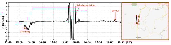 Recent observations [,] revealing the hourly scale characteristics of inland EQ precursors indicated that detecting these precursors is feasible. Compared with preseismic anomalies in low-frequency geoacoustic emissions and in ultralow frequency (ULF) and VLF electromagnetic emissions, preseismic anomalies within the atmospheric electrostatic field occur closer in time to strong inland EQs. Omori et al. [] noted that anomalous radon emissions trigger great decreases in the atmospheric field of the lower atmosphere (from the ground to an altitude of 2 km), as observed around the time of the Kobe EQ in 1995. They further suggested that the behavior of radon in terms of the atmospheric electrostatic process can explain the seismic precursors observed near the ground. Omori et al. [] further suggested that the behavior of radon in terms of the atmospheric electrical quasistatic process can explain seismic precursors observed near the ground. Choudhury et al. [] described the characteristics of the vertical atmospheric electrostatic field as negative 7–12 h before an EQ according to the statistics of 30 EQ events of various classes over northern India. Smirnov [] reported more than one hundred cases featuring negative vertical Ez anomalies approximately one day in advance for Ms 4–6 EQs, but similar to the relationship between Ez and magnitude, the Ez value and epicentral location do not exhibit an obvious relationship. Furthermore, previous studies indicated that the near-surface atmospheric electrostatic field is unique in that it becomes anomalously negative (the downward direction of Ez is defined as positive under fair-weather conditions) just before some EQs under fair-weather conditions [,], but these studies did not summarize the features of the electrostatic field at an hourly scale. Thus, this paper examines the hourly scale features of anomalously negative signals of the atmospheric electrostatic field as precursors. These signals could be the most stable and reliable indicator warning of an imminent EQ several hours to one day in advance and could therefore be leveraged to alert people of an impending emergency.