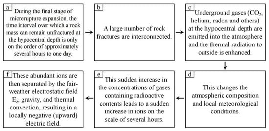 The above process illustrated in Figure 3 describes a possible hourly scale critical state. The rock mass at the hypocentral depth is in a critical state during the final stage of microrupture expansion before an EQ. However, the stress field acting on the interface and fracturing the rock varies depending on different sources of stress; consequently, the time period in which an EQ occurs differs among different locations at the hourly scale. Nevertheless, all of the evidence indicates that, at this stage, the time interval over which a rock mass can remain unfractured at the hypocentral depth is approximately several hours to one day. This is likely to be a common feature of inland EQs worldwide that are triggered by the eventual cracking of rock masses under driving stresses. In addition, abundant rock fractures are interconnected at the subsurface and are prepared to slip and rupture. Furthermore, the high-temperature and high-pressure environment deep underground drives the emission of gases (such as CO2, helium, radon and water vapor) [,] from the hypocentral depth to the atmosphere, which enhances the output of thermal radiation and causes sudden changes in the atmospheric composition and local meteorological conditions. These radioactive gases can, in turn, undergo decay and emit α particles [,,,,,,], which may further ionize the local atmosphere within minutes. With the increasing emission of radioactive gases, many positively and negatively charged particles are injected close to the surface near the epicenter. Then, a large number of electron-ion pairs disperse in the air and cations and anions, which carry positive and negative charges, respectively, are separated by the fair-weather electrostatic static field Ez, gravity and thermal convection and are transported down and up, respectively. Then, a newly established upward electric field is formed in the atmosphere. This whole process can be completed within minutes. This illustrates that, in the final stage leading up to an EQ, there is a large release of radioactive gases such as radon near the impending fracture region. Finally, these numerous ions are separated by the fair-weather electrostatic field Ez, gravity and thermal convection, resulting in a locally polarized electric field, the direction of which opposes that of the natural electric field under fair weather; thus, these anomalous features can be easily identified. Ultimately, multipoint observations near the fracture zone can simultaneously confirm whether the signals are cosourced and facilitate their verification. Thus, the geological movement of deep rock induces an abnormal Ez signal, which is a very short-term precursor to an imminent emergency. However, there has not yet been established a large-scale monitoring network, and there are few observation sites. Moreover, the observation of meteorological conditions at the same location has not been covered. Therefore, sufficient statistical instances to support earthquake forecasting are not available.