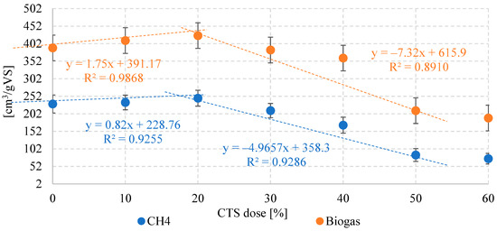 The results indicate a strong correlation between biogas/CH4 production trends and the CTS dose in the feedstock. This linear correlation progresses in a down-curve pattern (Figure 1). The increase in CTS dose (0% to 20%) in variants V1–V2 was found to very strongly and positively correlate with biogas production (R2 = 0.9868), as well as CH4 production (R2 = 0.9255) (Figure 1). This trend was reversed in variants V3 (20% CTS) to V7 (60% CTS), where the increasing of CTS dose was found to very strongly and negatively correlate with biogas production (R2 = 0.8910) and specific CH4 production (R2 = 0.9286) (Figure 1).