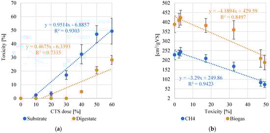 Correlations between (a) CTS in the feedstock and feedstock/digestate toxicity, (b) feedstock toxicity and biogas/CH4 production.