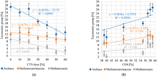 Correlations between (a) CTS in the feedstock and the contribution of basic taxonomic groups of methanogens, (b) the contribution of individual taxonomic groups of methanogens and CH4 in the biogas.