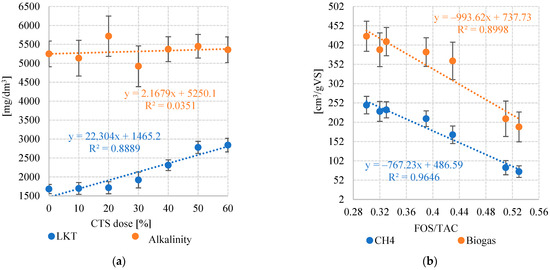 Correlations between (a) CTS in the feedstock and VFA/total alkalinity, (b) FOS/TAC and specific biogas/CH4 production.