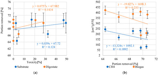 Correlations between (a) toxicity and portion digested, (b) portion digested and specific biogas/CH4 production.