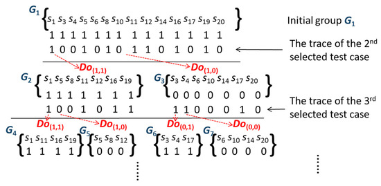 In this example, statements of the initial group G1 (Gj, j denotes the group id) are covered by a failed test case, implying that the statements {s1, s3, s4, s5, s6, s8, s10, s11, s12, s14, s16, s17, s19, s20} may contain a fault. Further, we set the statements {s1, s3, s4, s5, s6, s8, s10, s11, s12, s14, s16, s17, s19, s20} as initial group G1. The trace of the 2nd selected test case is different from the initial G1. The 2nd selected test case would divide the initial group G1 into two subgroups, G2 {s1, s5, s8, s11, s12, s16, s19} and G3 {s3, s4, s6, s10, s14, s17, s20}, which correspond to division operations Do(1,1) and Do(1,0), respectively. Further, the 3rd selected test case may divide G2 and G3 into G4, G5, G6, and G7, which correspond to Do(1,1), Do(1,0), Do(0,1), and Do(1,0), respectively. According to the previous coverage condition, we can learn of the next situation, in which Do(1,-) can be divided into Do(1,1), and Do(1,0), Do(0,-) can be divided into Do(0,1) and Do(0,0), and so on.