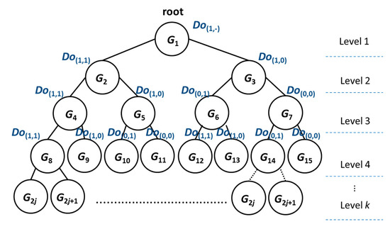 Starting from group G1, the group can be divided into two subgroups: G2 and G3 when the 2nd selected test case is input. Then, when the 3rd selected test case is input, G2 may be divided into two subgroups: G4 and G5; G3 may be divided into two subgroups: G6 and G7, and so on. The procedure of the division group would generate a binary tree (called a MADAG tree), as shown in Figure 3. To facilitate the presentation of our strategy, we assigned each group a unique group id by level-order in the MADAG tree. In order to not undermine the sequential numbering in this tree, a group id would be represented as G2j and G2j+1 from the parent node Gj (j starts from 1). Even if one of the groups (leaf node) cannot be divided into any subgroups (the number of statements in this group is less than two or it cannot be divided anymore by any test case), we still keep the group number to show which group does not exist. Therefore, the kth level has 2k−1 groups at most in the MADAG tree. On the kth level, the numbering of group id is As an example of k = 4, the number of groups is 23, and the numbering ranges from G8 to G15.