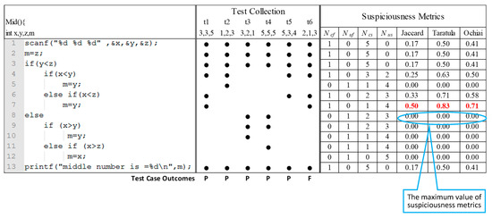 To understand how the MADAG strategy works, we use an example program Mid() with the spectrum of test cases and suspiciousness metrics as shown in Figure 4. This program (adapted from Jones et al. [18] and Santelices [28]) takes three input values, namely x, y, and z, and then provides the median value as its output. Suppose that the program has 6 test cases t1, t2…, t6 and 13 statements s1, s2…, s13. For the program Mid(), a faulty statement is at s7 (m = y;). A black dot for a statement in a test case implies that the corresponding statement is executed in the corresponding test case. The program spectra refer to obtaining such dots for the execution traces of each test case.