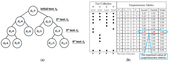The procedure of the MADAG strategy generates the binary tree shown in Figure 5a. As the number of statements in the group was less than 2 (the left of colon denotes group id, and the right of the colon denotes the number of the group in Figure 5), the group cannot be divided into any subgroups (e.g., G5 and G6), but we still keep the numbered for the subgroups. After applying our strategy, we collect the program spectra and test results from the selected test case {t6, t3, t2, t5}. Jaccard, Tarantula, and Ochiai all assigned the s7 statement a high suspiciousness score by using only four test cases and the suspiciousness scores of them are shown in Figure 5b. Even if we selected t4 on level 2, the selection result of our strategy would be {t6, t4, t2, t5} and the effectiveness of fault localization would be the same: {t6, t3, t2, t5}.