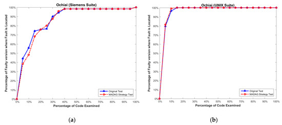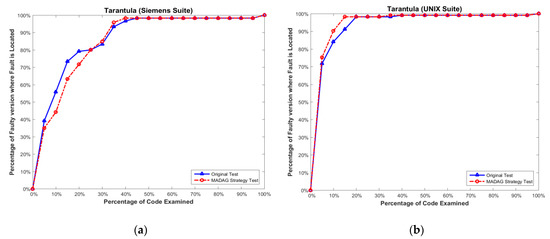 In Figure 6b, the MADAG test and original test are similar in the shapes of the curves for effectiveness. However, the curve of the MADAG test is always higher than that of the original test until 15%, where they overlap. Moreover, we apply the selected test cases to the Tarantula and Jaccard to measure the effectiveness of fault localization. The Tarantula has similar effectiveness to the Ochiai for the Siemens and UNIX suites (Figure 7a,b). Among them, the effectiveness of the Ochiai is still superior to Tarantula. Jaccard has the worst efficiency compared with Tarantula and Ochiai [1,2].