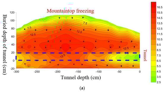 Vector Diagram of Tunnel Longitudinal Temperature Distribution at Test Air Temperature −1.6 °C: (a) 0 m/s; (b) 1.8 m/s.