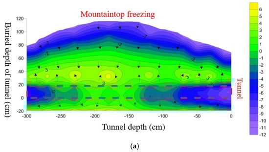 It can be seen from the overall temperature distribution vector diagram of the tunnel that when the test air temperature is low, there is an obvious thermonuclear region in the surrounding rock of the mountain. As the test air temperature decreases, the thermonuclear region gradually shrinks, the surrounding-rock freezing area at the arch bottom gradually increases, and the surrounding-rock freezing area at the arch crown gradually expands to the inside of the mountain. Compared with no ventilation, the influence of ventilation on the longitudinal and radial temperature distribution of the tunnel is more obvious, and the greater the wind speed is the greater the influence is. In particular, the longitudinal temperature distribution of the tunnel is more widely affected by ventilation [32].