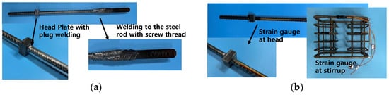 During the test, displacement transducers (LVDTs) were employed to measure the axial deformation of CHBC (Figure 4). Additionally, micrometer calipers were used to observe the slip between the headed rebar and concrete (Figure 5a). In addition, strain gauges were placed on the headed bars and stirrups, respectively, (Figure 5b) to detect the strain development.
