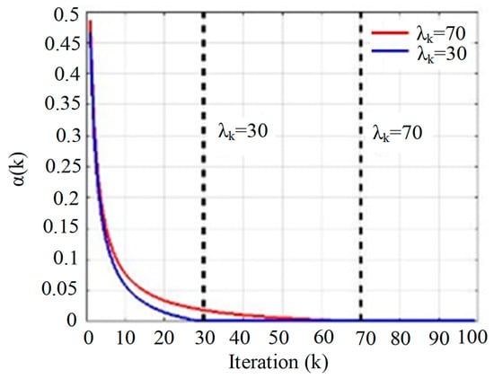 where Ka represents the gain of the angular acceleration error. Subscript k denotes the kth data. and denote the desired acceleration of the link and the actual acceleration of the kth output, respectively. Further, the past information regarding the input, which contains the interference to which the system was subjected in the past, is added to improve the tracking performance in (8a). α is the parameter that adjusts the ratio between the previous and present input in (8b). λk is a positive number. The function, α, decays as the iteration number, k, increases. When k is larger than λk, α is 0. This property means that when the number of iterations is more than λk, it no longer needs the information obtained from the previous iteration and guarantees the convergence of the ILC algorithm. Figure 3 shows the function of α(k) for various gains λk.