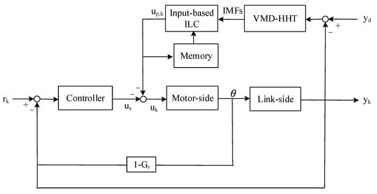 Figure 1 illustrates the robotic arm with the joints equipped with harmonic drive actuators. The elastic-joint model in Figure 1a was utilized to analyze the dynamics of a robotic arm that uses the joints of DC motors integrated with the harmonic drives in Figure 1c. The elastic-joint dynamics models the flexible joint by connecting a linear torsional spring between the motor and link. The energy absorbed and released between the mechanisms causes a residual vibration. Figure 1b shows the proposed VH-ILC-EJ method to suppress the residual vibration of the robotic arm. The mode number, V, observed via VMD, inputs into the HHT to generate IMFs. The features extracted from the VMD are fed into the ILC to generate the ILC control input, up. The control input of the VH-ILC-EJ method is determined by adding up and the input of the elastic-torque feedback controller, us.