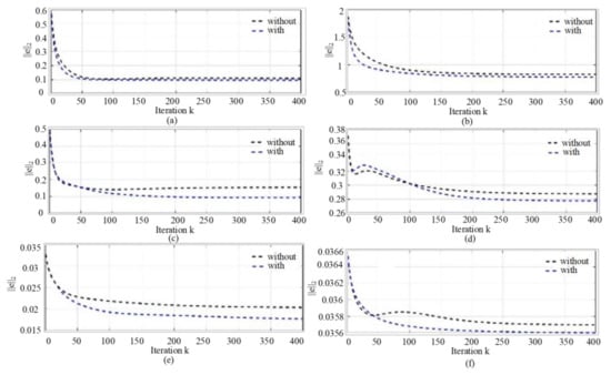 After 400 iterations, a new input is produced to effectively suppress the residual vibration, so there is no residual vibration on the six-axis of the manipulator at the point of arrival. The position 2 norm error is shown in Figure 6. Using the previous information, a new input is produced to suppress the residual vibration effectively. After using the previous information, the rate of convergence increases, and the tracking error is reduced. At the same time, the input changes in the initial iteration are also relatively stable. In this simulation, only the information from the previous iteration was added, and a significant effect was obtained. If more past information is added, the effect should be better, but the learning gain of ILC needs to be re-adjusted to achieve the best performance. The statistics data of input-based ILC is summarized in Table 3.