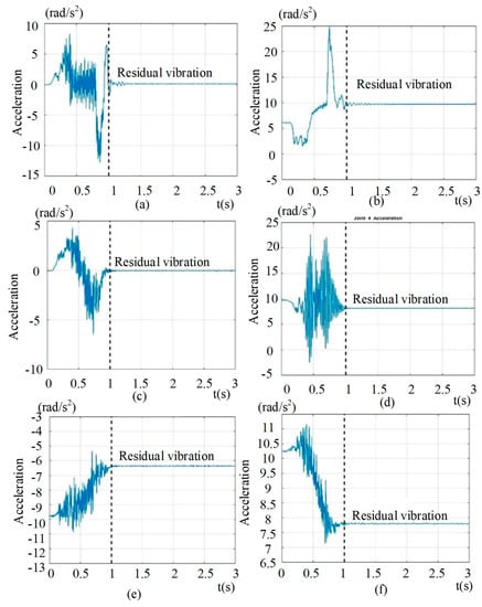 The vibration signal analysis of a single joint involves two steps. As shown in Figure 8a, the inertial measurement unit (IMU) sensor is installed at the joint for measuring the acceleration data to observe the converge rate and vibrations when each joint rotates in the counterclockwise (CCW) and clockwise (CW) direction three times. Figure 8b–g and Figure 9a–f show the measuring acceleration data when the joints rotate 70, 55, 70, 35, 50, and 40 degrees in the CCW and CW direction, respectively. The experimental results show that the first three joints have a more significant residual vibration, while the last three have a trivial residual vibration. Only the vibration signals of the first three joints need to be analyzed and extracted.