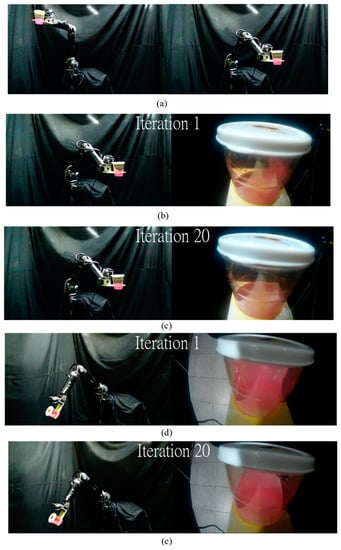 Figure 11 demonstrates the experimental results of applying the VH-ILC-EJ method to the laboratory-developed 6-DOF robotic arm with Kp = 1.2, Kd = 0.3, Ka = 1, and λk = 10. Figure 11a shows two screenshots of a scenario where the robotic arm moves a cup filled with liquid. Figure 11b,c are screenshots of the movements of iterations 1 and 20 for the experiment to validate the effects of VMD-HHT. Iteration 1, considered the ILC, is not implemented, while iteration 20, as the VH-ILC-ET method, is implemented. The experimental results show that the liquid in the container is more stable when implementing the VH-ILC-EJ method, demonstrating a vibration suppression ability. Figure 11d,e are screenshots of the movements of iterations 1 and 20 for the experiment to validate the effects of ILC. Iteration 1, considered the ILC, is not implemented, while iteration 20, as the ILC is implemented. The liquid in the container is more stable when the ILC is implemented. From Figure 11c,e, the VH-ILC-EJ method performs better than ILC-EJ method.