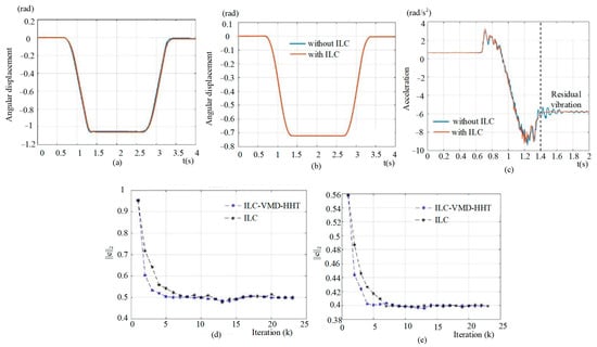 Figure 12a,b shows the link-side angular displacements of the first and second joints, and Figure 12c shows the acceleration data of the second joint with and without implementing ILC. In multi-joint experiments, the vibrations of the first joint are obvious. Similarly, in the iterative process, the error caused by vibration gradually decreases, and the convergence rate of ILC-VMD-HHT is faster than that of ILC. Because there is no obvious vibration in the measurement of second joint, the performance of vibration suppression from the acceleration in the relevant direction is discussed. Similarly, in the iterative process, the error caused by vibration gradually decreases, and the convergence rate of ILC-VMD-HHT is faster than that of ILC. Because there is no obvious vibration in the measurement of the second joint, we discuss the performance of vibration suppression from the acceleration in the relevant direction.