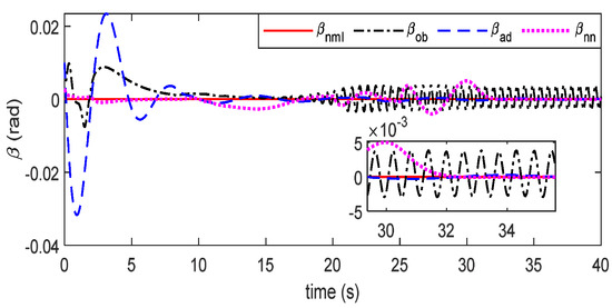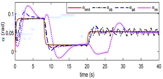 Furthermore, due to unknown effects being integrated into one item to facilitate the observation of NDO, the larger deflection angles of control surfaces are needed to cope with the estimated effects through NDO, as shown in the response curves of control surfaces of Figure 9, Figure 10 and Figure 11 after the 20th second. Moreover, given the heavy online computational load of neural networks, the application of FTC controller resting on RBFNN is utilized to handle effects (, and ) one-by-one obtain excellent tracking effects, but this FTC scheme shows a low convergence speed, shown in the tracking effects of in Figure 9, Figure 10 and Figure 11. To remedy this, the FTC algorithm of this work is developed by employing adaptive observers and estimators in conjunction with adaptive feedback control, which has a known and fixed control structure and does not need the exact knowledge of inertial matrix (J and ). Finally, the simulation results show that the proposed FTC strategy in this work can suppress unexpected effects and maintain excellent tracking performance.