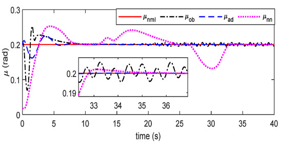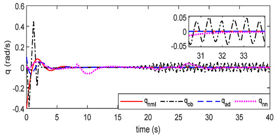 As shown in Figure 3, Figure 4, Figure 5, Figure 6, Figure 7, Figure 8, Figure 9, Figure 10 and Figure 11, is the expected index of HSV’s slow and fast loops. represents the fault-tolerant control effect of sliding mode controller (SMC) combined with the nonlinear disturbance observer (NDO) [35] by moving the uncertainties of on the right hands of attitude dynamics, and represents the simulation results of a control scheme that is composed of nonlinear generalized predictive control (NGPC) and radial basis function neural network (RBFNN), as shown in [10]. In addition, denotes the control effect of the controller designed in this paper. On the basis of Figure 3, Figure 4, Figure 5, Figure 6, Figure 7 and Figure 8, in case of actuator failure only at the fifth second, attitude angles () with and tracking effect, has faster convergence speed. The main reason may be the heavy line load calculation of RBFNN and the horizontal regression principle of NGPC. Before the centroid shift occurs, it is straightforward to verify that the above controller presents an acceptable FTC tracking effect based on the arguments above.