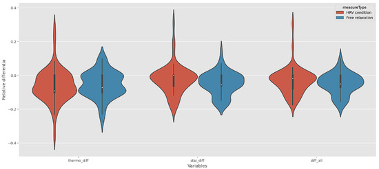 Table 2 shows the means and standard deviations of the variables in each group. The negative values represent the reduction of stress and other parameters. As we can see, only the DT parameter (thermo_diff) obtained better results in the HRV condition group.