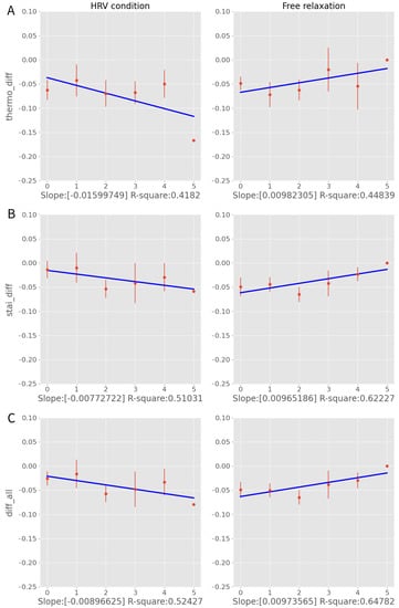 Figure 2 shows the fitted lines, with Figure 2A showing the comparison of the two methodologies on the thermo_diff variable, Figure 2B on the stai_diff variable and Figure 2C on the diff_all variable. The field around the points is the ‘standard error bar’ (standard deviation divided by the root of the number of elements). The relative differences of the STAIS-5 and DT slightly decreased over time in the HRV-BF group (i.e., the absolute values increased, so the stress reduction was greater), whereas in the free relaxation group the relative differences increased (i.e., they approached zero, so the absolute values decreased, which means that free relaxation could reduce stress less and less over time). The average value of the relative difference in stress scores (diff_all) also showed a decreasing trend in the HRV-BF group and an increase in the free relaxation group. Overall, this implies that the participants were able to learn the breathing technique better over time, so that the HRV biofeedback condition contributes to better stress reduction, while the free relaxation becomes less and less effective in this regard.