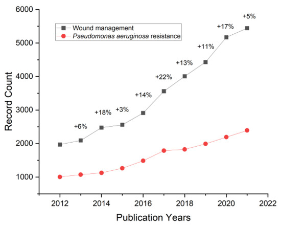 The trend in the number of scientific works published in the past decade on the topic of wound management. Percentages indicate the increase in the number of scientific papers each year compared to the preceding year. Visualized based on the data from Clarivate Analytics Web of Science (topic keywords: “wound management” and “Pseudomonas aeruginosa resistance”, access date: 13 November 2022).