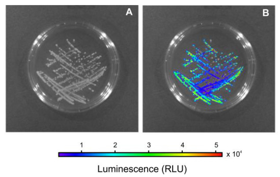 Electrotransfection of P. aeruginosa ATCC27853 bacterial strain was performed with the pAKlux2 plasmid (Addgene plasmid #14080), as was described previously [5]. Briefly, this plasmid contains the luxCDABE operon obtained from luciferase (luxAB) and fatty acid reductase (lux CDE) genes. Therefore, only the live bacteria are bioluminescent (Figure 2).