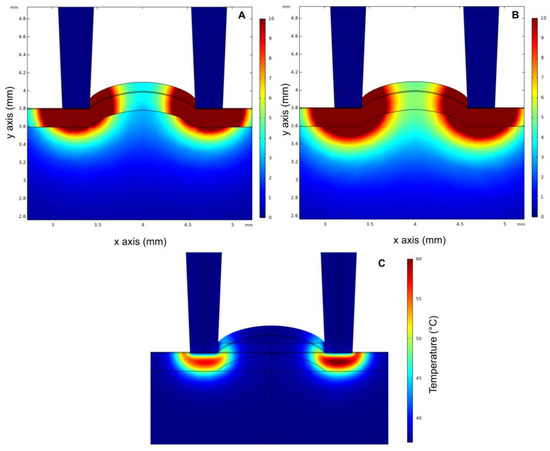 The spatial distribution of the electric field during pulsed electric field treatment, where (A) tissue conductivities are nominal and not affected by PEF; (B) tissue electrical conductivities are increased due to permeabilization triggered by PEF; (C) Joule heating due to PEF application. A 3 kV voltage is applied between the terminals (gap 1.2 mm). The electric field spatial distribution data are shown in kV/cm.