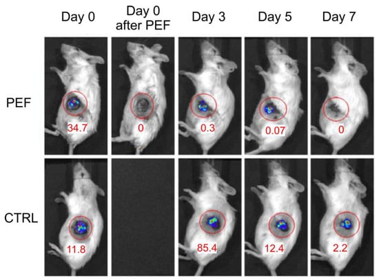 At the same time, PEF + AA treatment results in the effective killing of bacteria. Shortly after the treatment, the luminescence signal was beyond the detection limits of our infrastructure. On day 3, in some experimental mice, a weak signal could be detected; however, in general, it was lower when compared to the AA-only treatment.