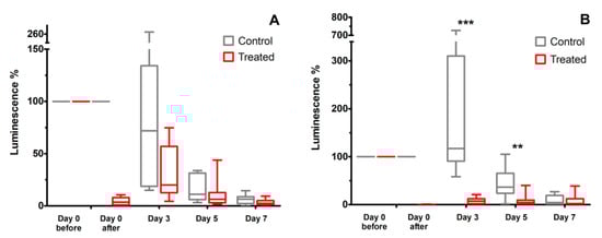 The luminescence of the ROI after the treatment using 1.8 kV protocol (A) and 3 kV protocol (B). All the data were normalized to the CTRL group. Asterisks: ** p ≤ 0.01; *** p ≤ 0.001.