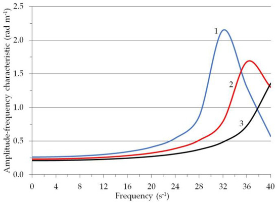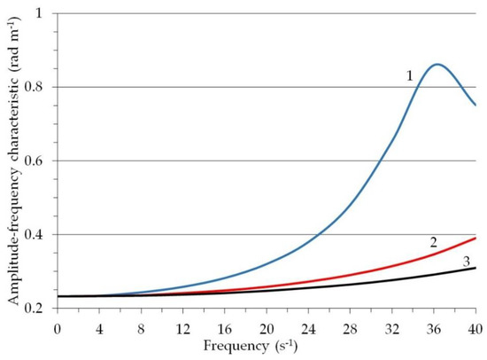 Thirdly, under the condition that the value of the parameter is equal to 4.8 m, the amplitude–frequency response of the dynamic system in the considered frequency range from 0 to 40 s−1 does not have an undesirable resonance peak at all (curve 3 in Figure 5).